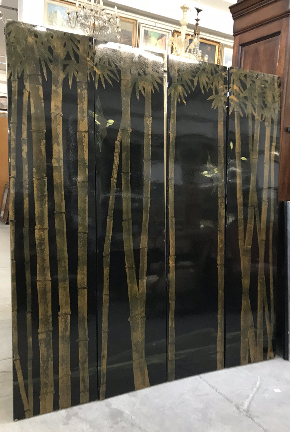 Gruppo di quattro pannelli decorativi laccati con bambú e uccelli su fondo nero (cm 40,5x184) (difetti)