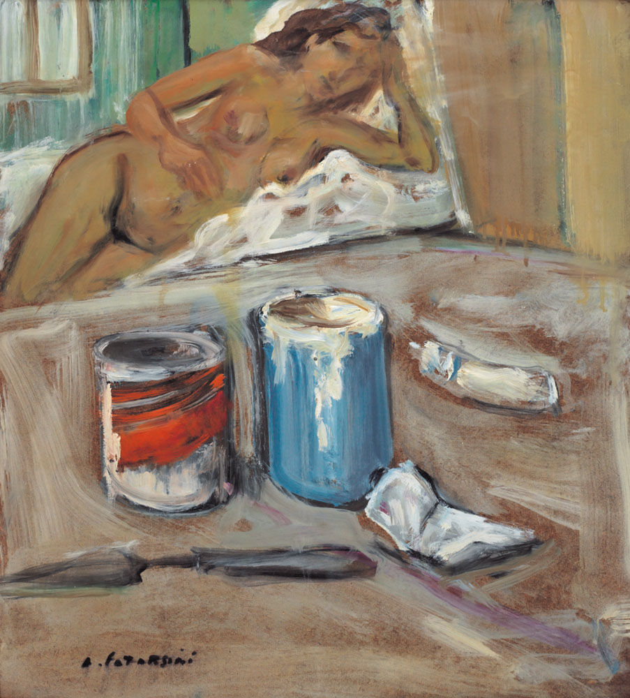 ALFREDO CATARSINI Viareggio 1899 - 1993 Composizione, 1970 olio su masonite cm. 50x45, firma in basso a sinistra, titolo, firma, anno e numero d'archivio al retro.