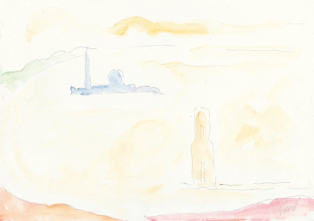 VIRGILIO GUIDI Roma 04/04/1891 - Venezia 07/01/1984  San Giorgio, 1978 acquerello su carta intelata cm. 34x48, firma in basso a destra, timbro a secco e firma per autenticità e provenienza di Gianni De Marco su foto.