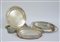 Lotto composto da due porta vivande in metallo argentato con interni in vetro e tre vassoi in metallo e ottone con bordi cordonati (difetti)