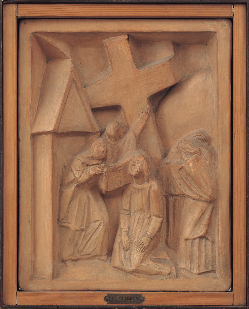 ARTURO MARTINI Treviso 02/08/1889 - Milano 22/03/1947  Incontro con Veronica, 1926/27 terracotta da stampo cm. 41x32x5,5; opera non firmata, questa formella è la quarta stazione della Via Crucis riprodotta in maiolica da stampo e pubblicata su "Arturo Martini, Catalogo Ragionato delle sculture" a cura di Gianni Vianello, Nico Stringa, Claudia Gianferrari, Neri Pozza Editore, al numero 179 tavola IV, pagina 120, dichiarazione d'autenticità della Dott.ssa Claudia Gian Ferrari perito esperto per l'Arte Moderna della Camera di Commercio di Milano su fotografia allegata.
