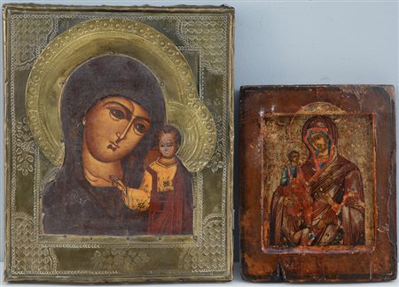 Lotto composto da due icone ad olio su tavola raffiguranti Madonna con Bambino, una con riza in metallo (misure diverse, difetti e restauri)
