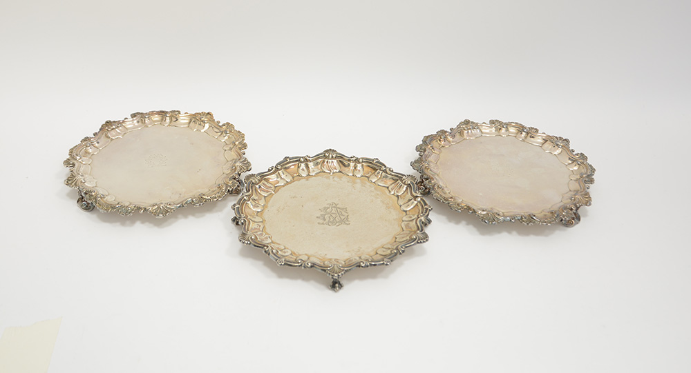 Salver in argento con punzoni inglesi (gr. 390) unito a due di simil decoro in metallo argentato