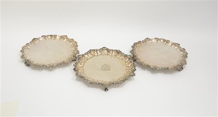 Salver in argento con punzoni inglesi (gr. 390) unito a due di simil decoro...