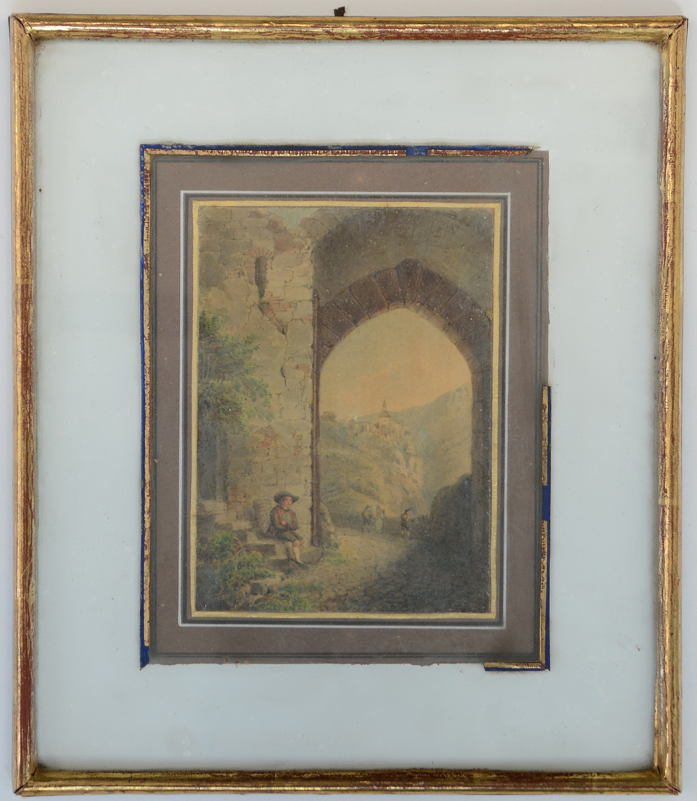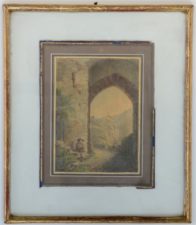 Scuola del secolo XIX "Paesaggio con figure" dipinto ad olio (cm 12x8) In cornice