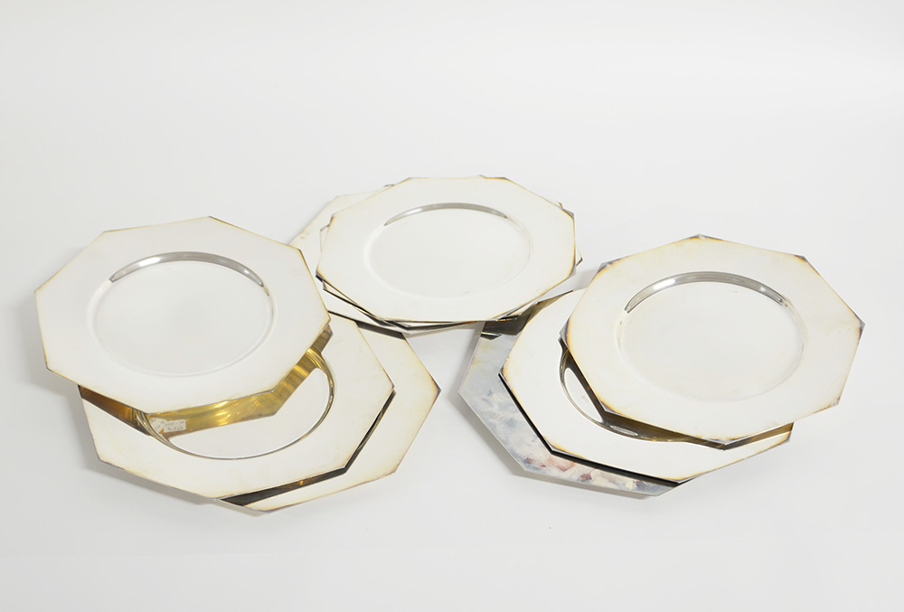 Gruppo di nove sottopiatti ottagonali in metallo argentato (lievi difetti)