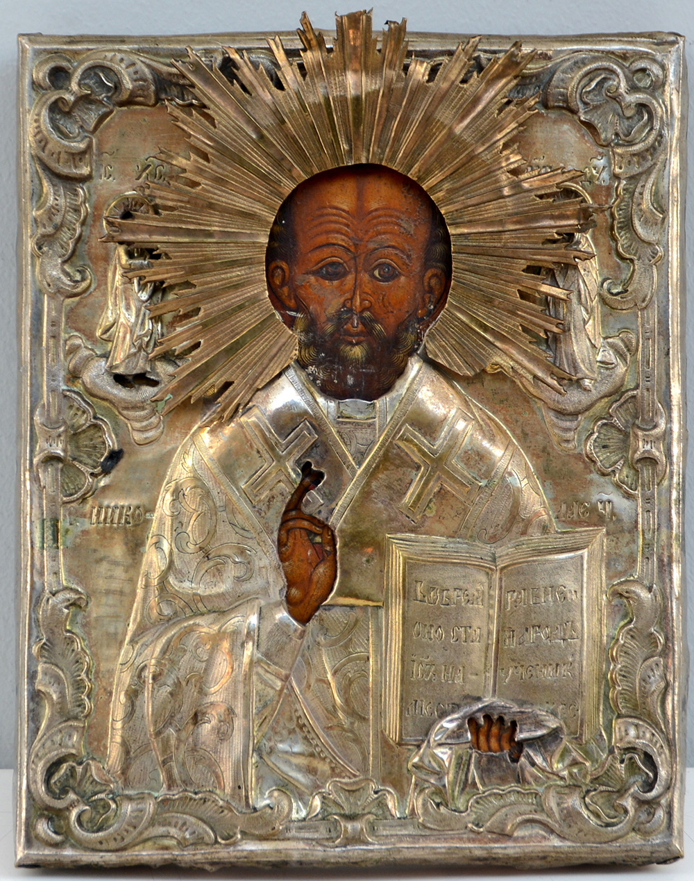 Icona ad olio su tavola raffigurante San Nicola, riza in metallo argentato. Secolo XIX (cm 26x20,5) (difetti)