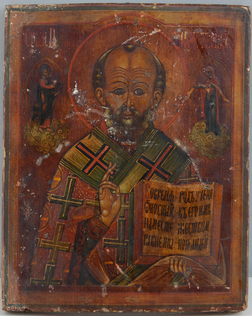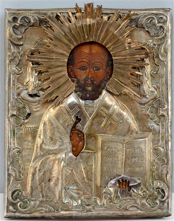 Icona ad olio su tavola raffigurante San Nicola, riza in metallo argentato....
