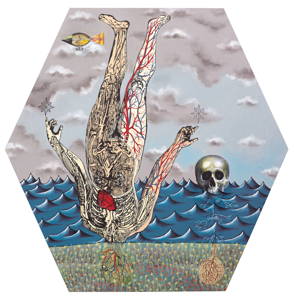 MASSIMO GURNARI Milano 01/05/1981 Invisible man, 2010 tecnica mista e collage su tela esagonale cm. 150x150, firma, titolo e anno al retro, opera senza cornice, pubblicato sul catalogo della mostra "Pensiero fluido", a cura di Alberto Mattia Martini, tenutasi dal 7 ottobre al 7 novembre 2010, presso lo Studio Oberdan (MI), pagina 96.