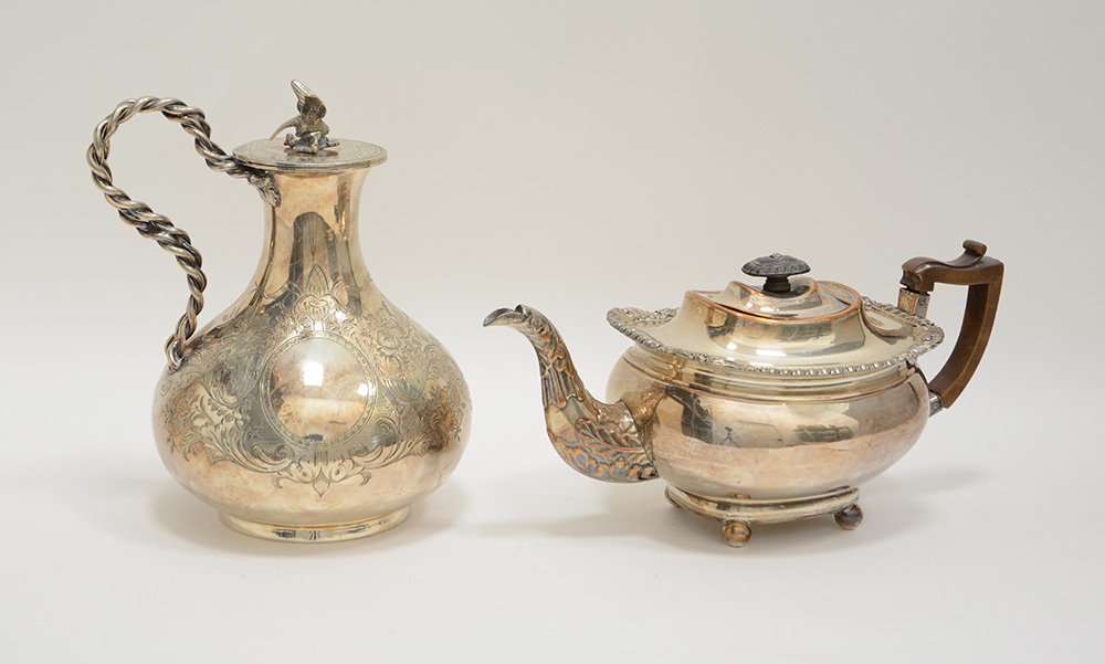 Lotto composto da una teiera e un versatoio in metallo argentato con decori...