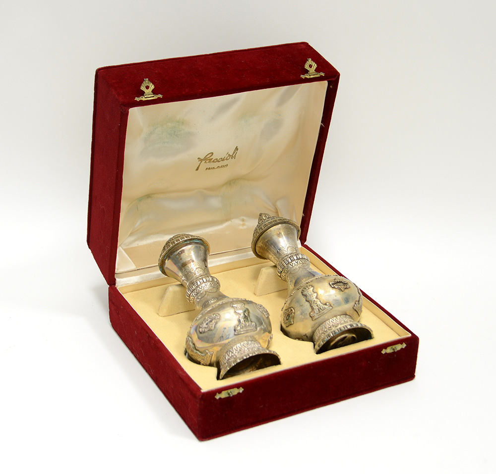Coppia di saliera e pepiera in argento con decori neoclassici. Argentiere Faccioli, Milano (g lordi 470 ca.) in custodia (lievi difetti)