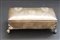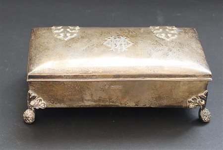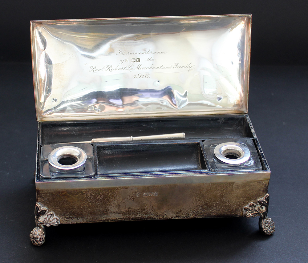 Calamaio in argento a forma di cofanetto, piedi a forma di frutti, dedicato e datato 1916, punzoni di Londra secolo XX (lievi difetti)