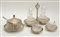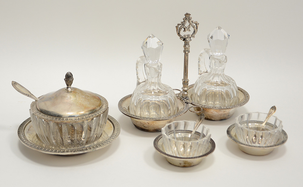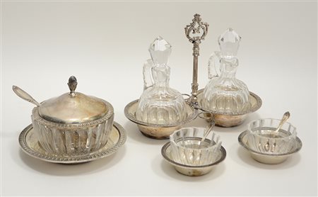 Lotto composto da un'oliera, una formaggera e due saliere con cucchiaini, in argento con contenitori in cristallo (g 730 ca.) (lievi difetti)