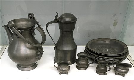 Lotto composto da un versatoio, un boccale, due brocchette, due piccoli boccali e dieci piatti in peltro di epoche diverse (difetti)