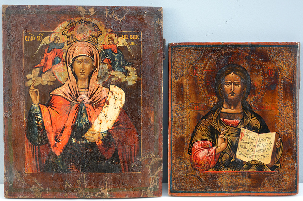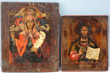 Lotto composto da due icone ad olio su tavola raffiguranti Cristo Benedicente e l'Incoronazione della Vergine. Secolo XIX (misure diverse, difetti e restauri)