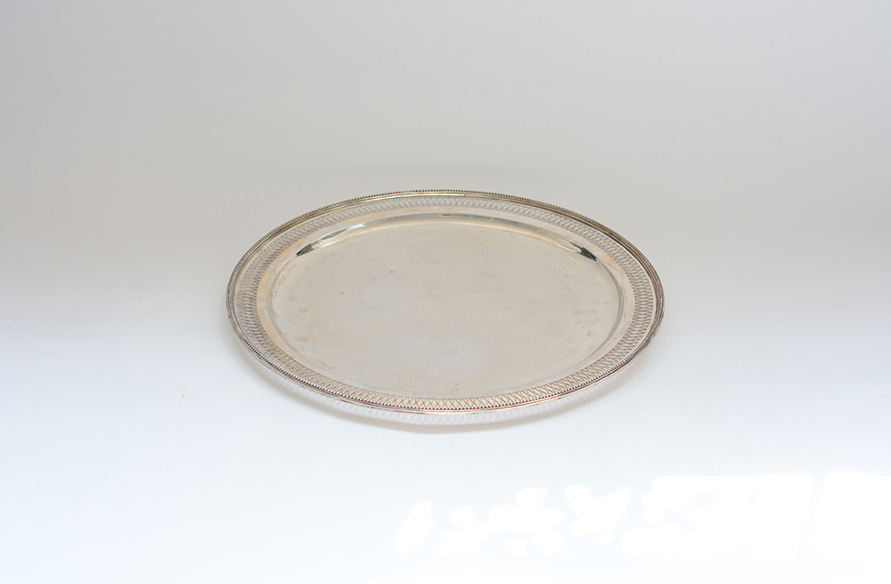 Vassoio di forma circolare in argento a perlinata e traforata. Alessandria metà secolo XX (g 1170 ca.) (d cm 40)