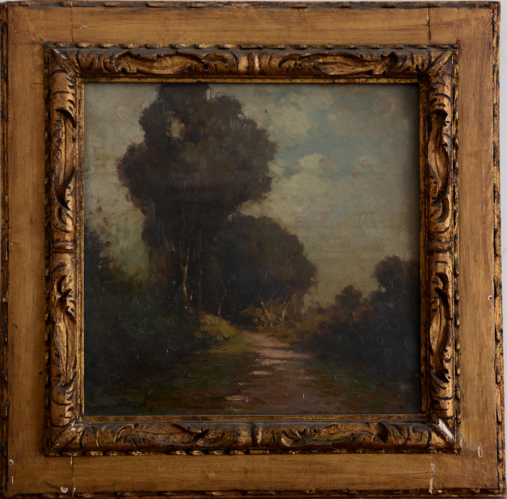 Firma indecifrata "Paesaggio boschivo" olio su tavola (cm 49x50) Firmato in basso a sinistra. In cornice (difetti)