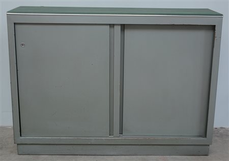 Mobile da ufficio a due ante scorrevoli in ferro, piano in pelle verde (cm 150x108x44) (difetti)