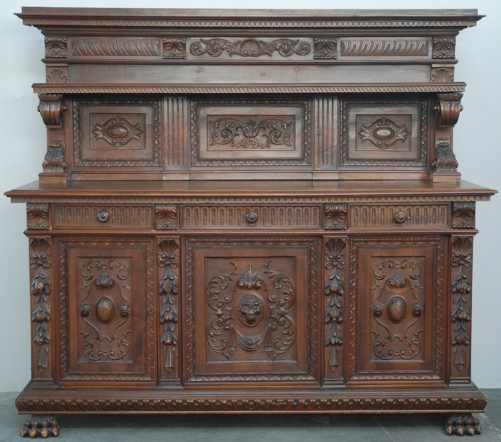 Credenza con alzata in noce, parte superiore a tre ante intagliate a stemmi e teste leonine. Parte inferiore a tre cassetti sottopiano e tre ante. Montanti scolpiti a frutti. Piedi a zampa ferina. (Lievi difetti)(cm 205x182x60)