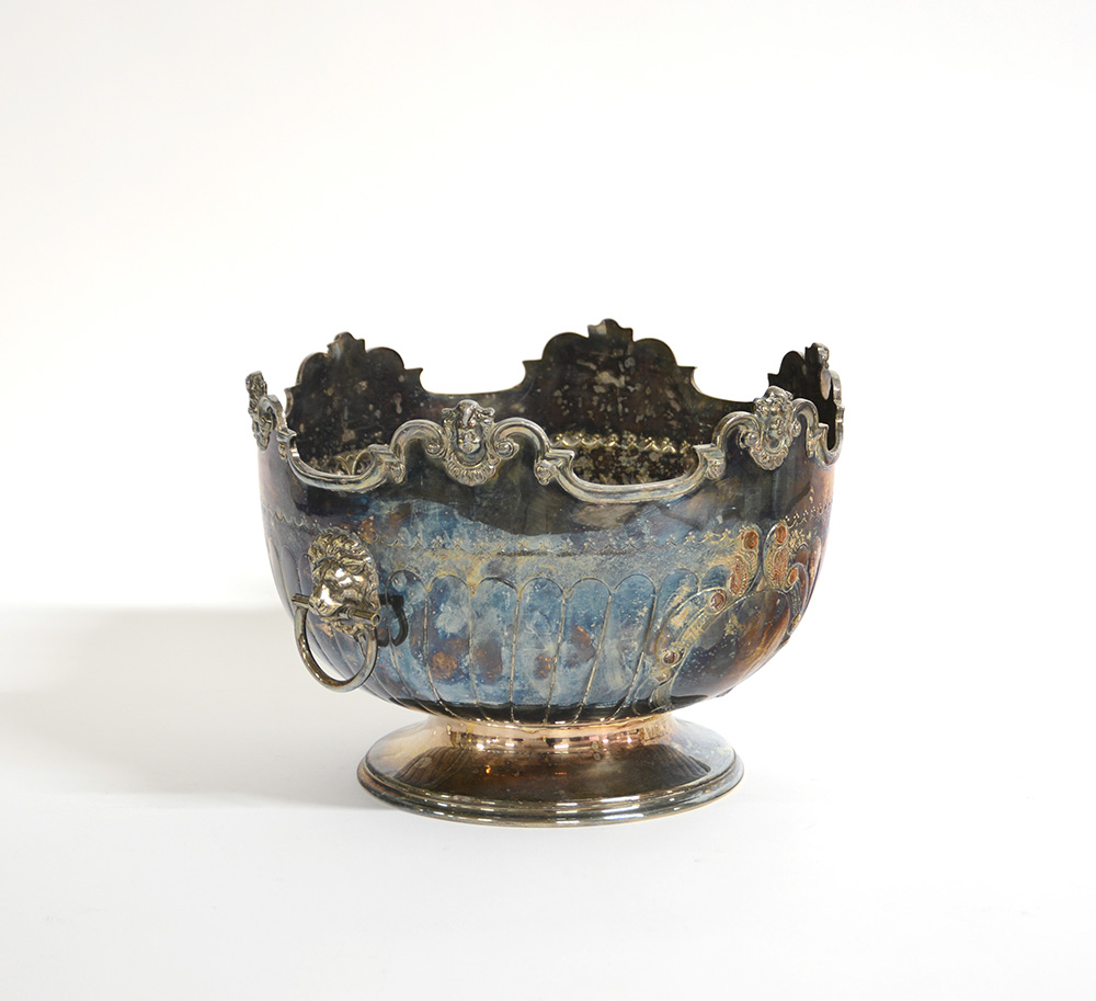 Bacile biansato in metallo argentato sbalzato e inciso (h. cm 22 x d. 31) (lievi difetti)