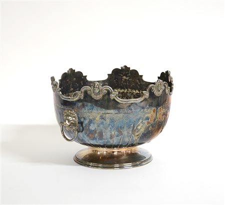 Bacile biansato in metallo argentato sbalzato e inciso (h. cm 22 x d. 31)...