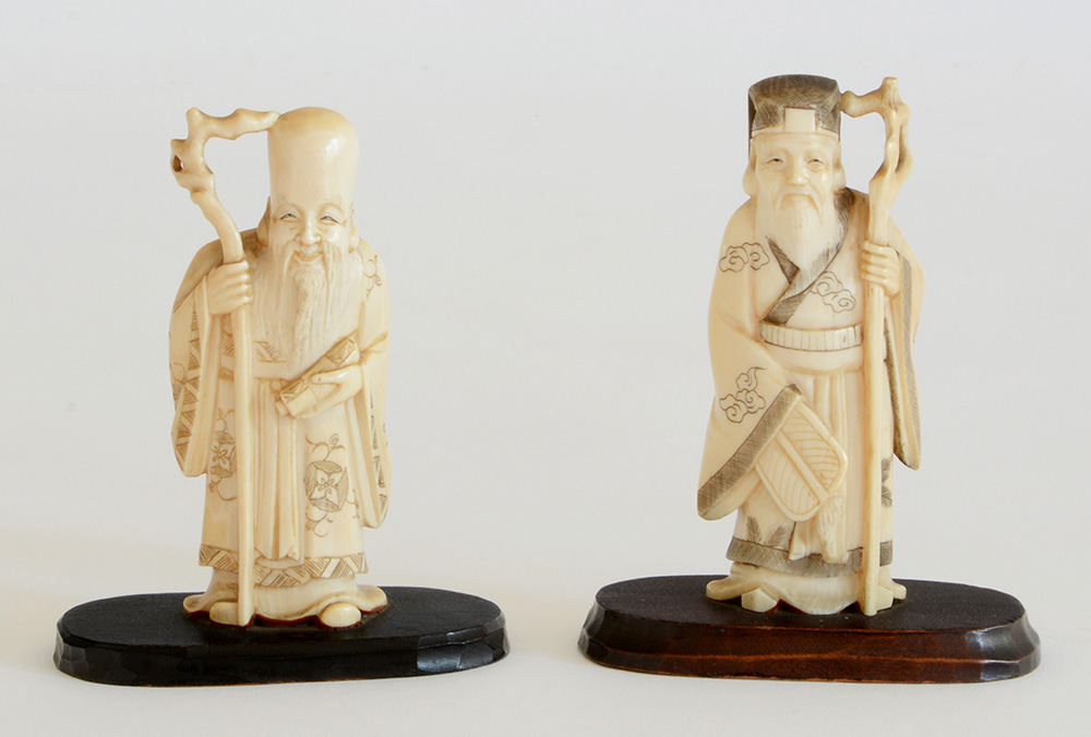 Coppia di sculturine in avorio raffiguranti Immortali (h cm 10,5)Giappone,...
