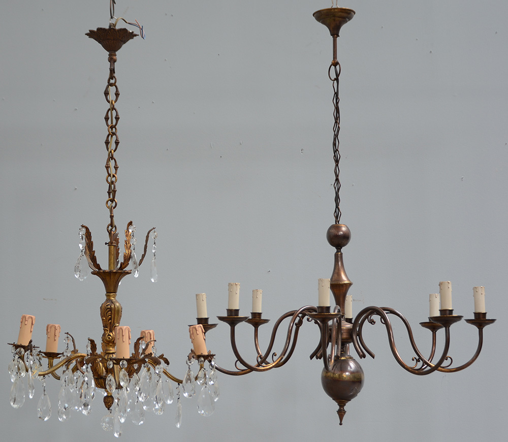 Lotto composto da un lampadario in stile olandese a otto luci e uno a sei luci con pendagli in cristallo (difetti)