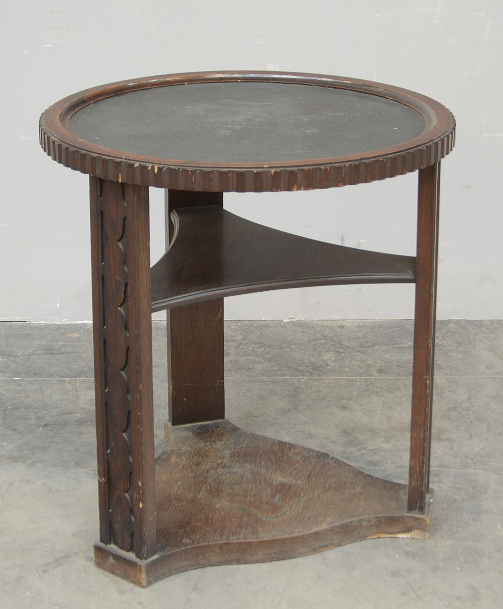 Tavolino tondo da salotto con montanti raccordati e piano a fascia scanalata (h cm 67, d cm 63) (difetti)