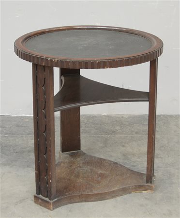 Tavolino tondo da salotto con montanti raccordati e piano a fascia scanalata...