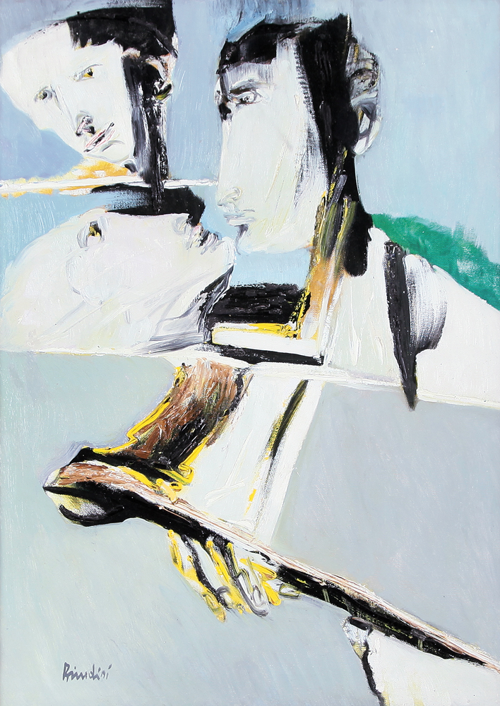 REMO BRINDISI Roma 25/04/1918 - Milano 25/07/1996 Oppositori, 1970 olio su tela rintelata cm. 70x50, firma in basso a sinistra, certificato di autenticità della Galleria B&B Arte (Canneto sull'Oglio) allegato con fotografia ritraente l'artista con l'opera.