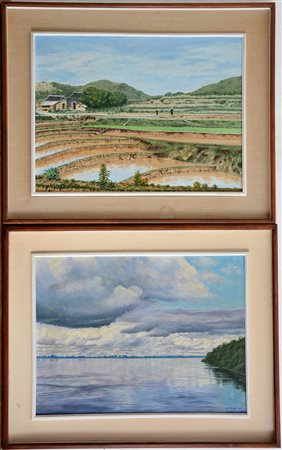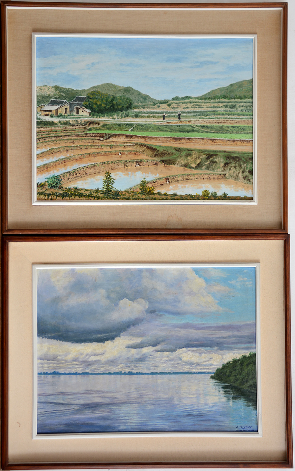 E. Migliau - lotto di due dipinti ad olio raffiguranti un paesaggio lacustre e campagna cinese, firmati e datati in basso (cm 45x60), in cornice (lievi difetti)