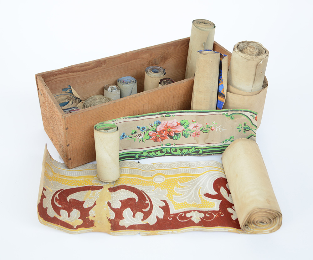 Cassetta contenente numerosi campioni di nastri di carta da parati (difetti)