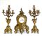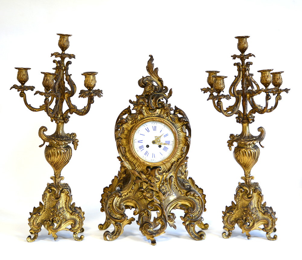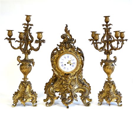 Trittico da camino in bronzo dorato di gusto rocaille, composto da due candelabri a sei fiamme e una pendola con quadrante smaltato a numeri arabi e romani e carica settimanale con sospensione a lamella. Secolo seconda metà sec. XIX (h max cm 64) (lievi difetti)