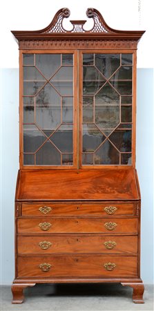 Mobile a due corpi con ribalta a quattro cassetti, parte superiore a vetrina. Inghilterra, secolo XIX (cm 107x204x55) (difetti)