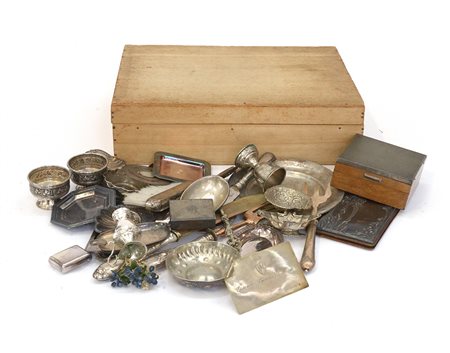 Scatola in legno contenente numerose bomboniere in argento e metallo (gr. lordi 1000) (difetti)