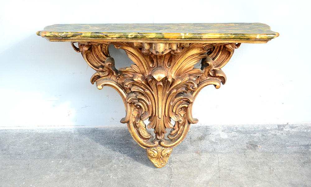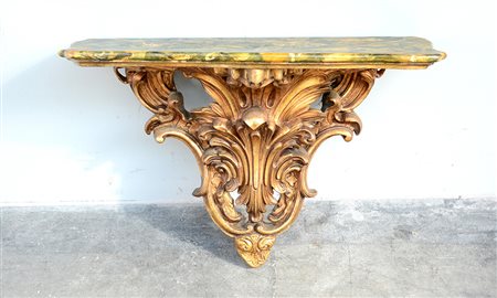 Antica mensola in legno intagliato e dorato scolpita a volute e motivi fogliati, piano in legno a finto marmo (h. cm 60x42x28)