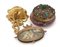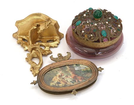Lotto composto da una cornice in bronzo, una piccola mensola in legno dorato e una scatola in vetro con coperchio in metallo dorato (difetti)