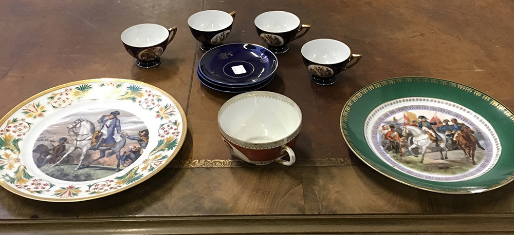 Lotto composto da due piatti in porcellana con raffigurazione Napoleoniche, quattro tazzine, tre piattini ed una tazza da the con immagine dell'Imperatore.