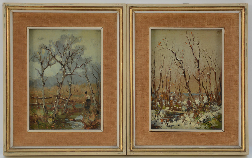"Paesaggi" 1937 coppia di dipinti ad olio su cartoncino (cm 17,5x12,5) firmati in basso. Titolati e datati al rerto, in cornice