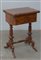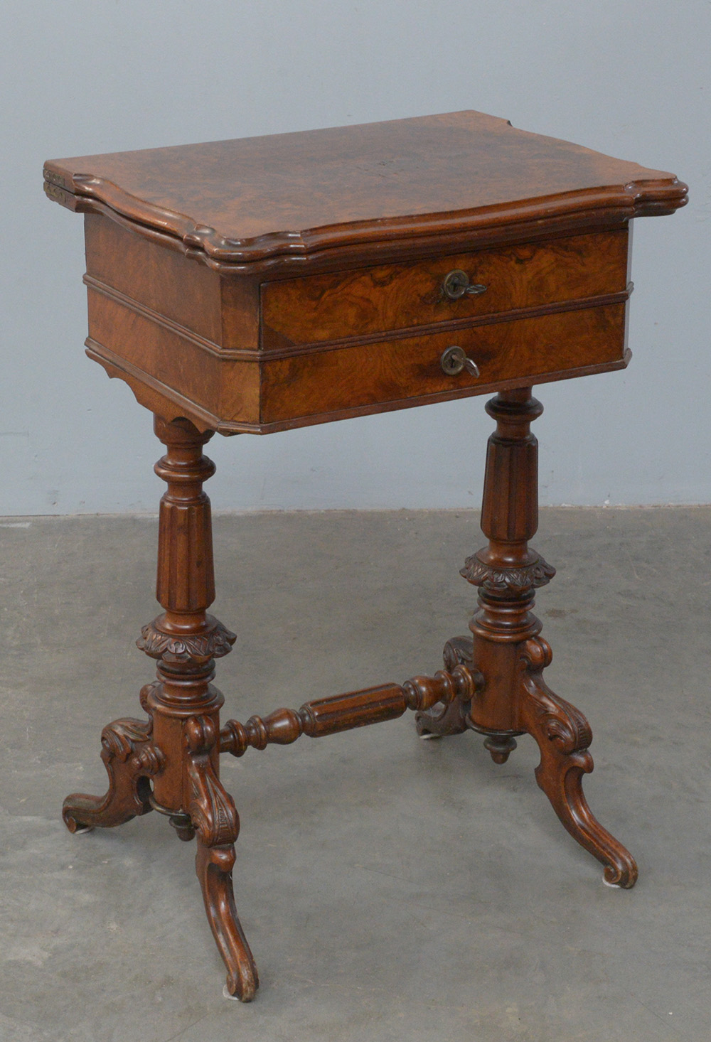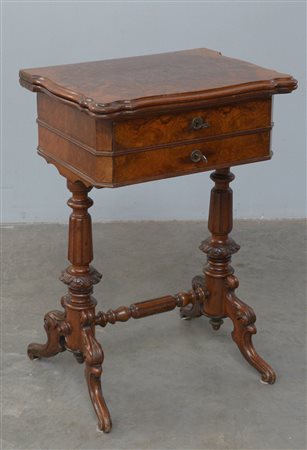 Tavolino da lavoro con piano radicato apribile a libro con all'interno scacchiera, due cassetti sottopiano, gambe e traverse tornite e scanalate (cm 53x80x41) (difetti)