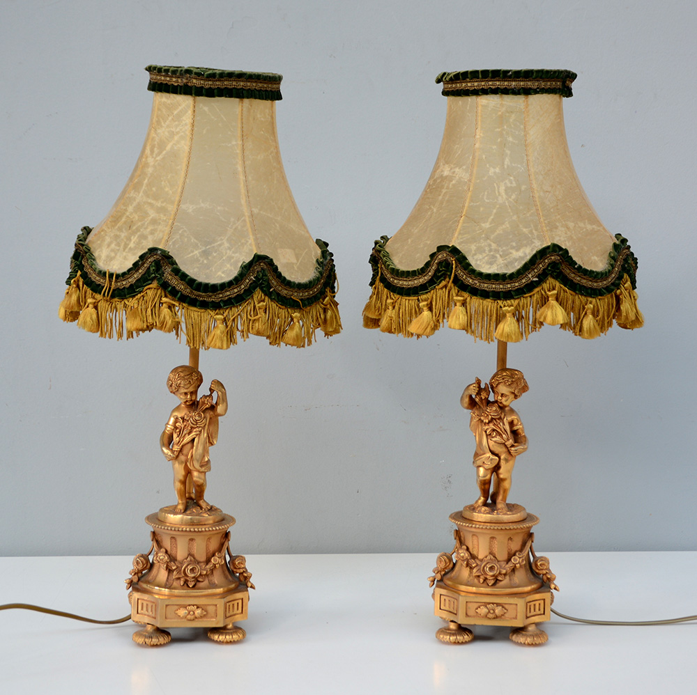 Coppia di lampade in metallo dorato decorati a putti a tutto tondo su basi...