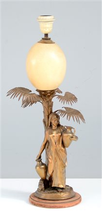 Lampada in metallo dorato raffigurante un'acquaiola sotto una palma, sormontata da uovo di struzzo (h. Cm 50) (difetti)