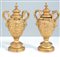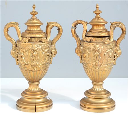 Coppia di vasi biansati con coperchio in metallo in stile neogotico su basi in legno dorato (h. cm 44) (difetti e restauri)