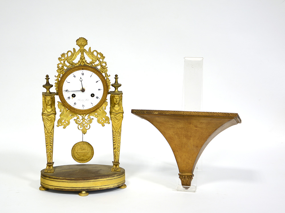 Pendola a portico in bronzo a base ovale, decorata con figure mitologiche e fregi sorretta da due erme laterali. Quadrante smaltato a numeri romani,firmato. Movimento con carica settimanale con suoneria delle ore e delle mezze su campanello e partitora, sospensione a filo, unito ad una mensola in legno di recente fattura. Prima metà sec. XIX (cm 25x41) (difetti)