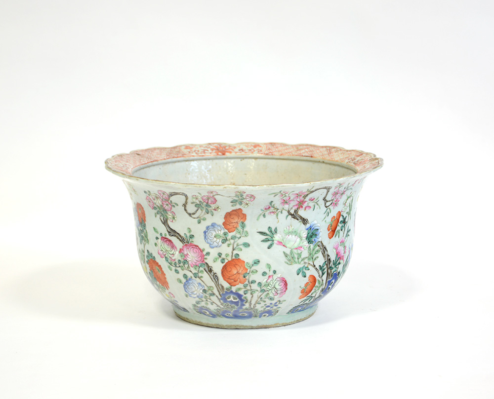 Cache pot in porcellana Famiglia Rosa decorato a rami fioriti policromi, bordo mistilineo. Cina, sec. XIX (cm 21x38) (lievi difetti)