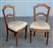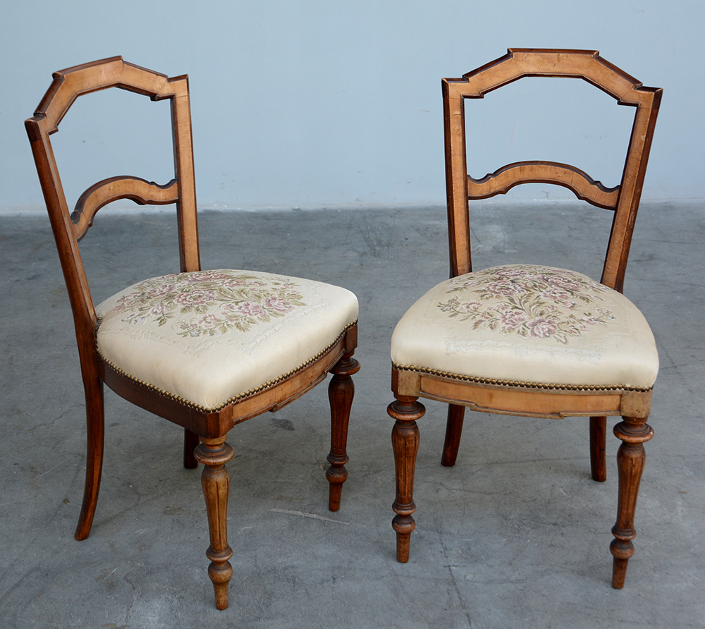 Coppia di sedie in noce con schienale a giorno e seduta in tessuto operato....