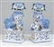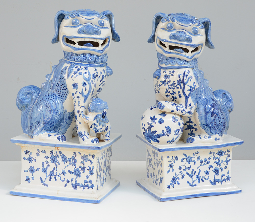 Coppia di leoni buddisti in porcellana bianca e blu