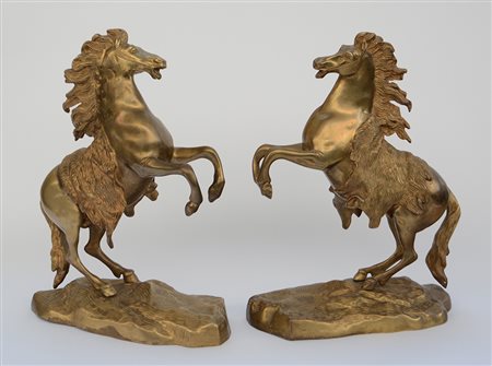 Coppia di sculture in bronzo dorato raffiguranti cavalli rampanti (h. cm 47)