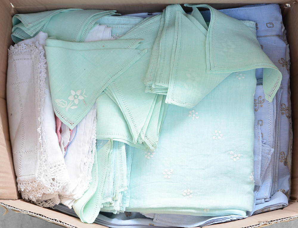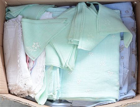 Cartone contenente numerose tovaglie e lenzuola in cotone o lino, anche...