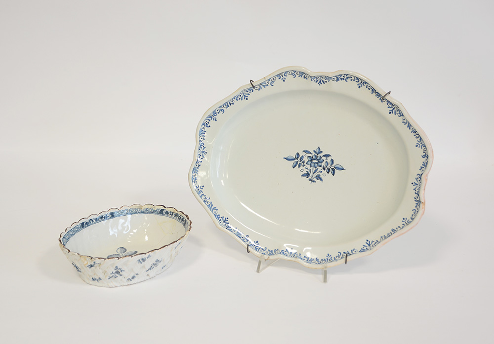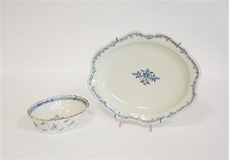 Lotto composto da un vassoio polilobato ed una vaschetta ovale in maiolica con decoro blu, misure diverse (difetti e restauri)